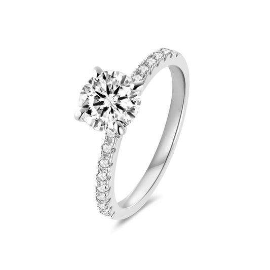 Solitaire Round Lab Diamond Ring with Pave Band in 18K White Gold 4 Prong